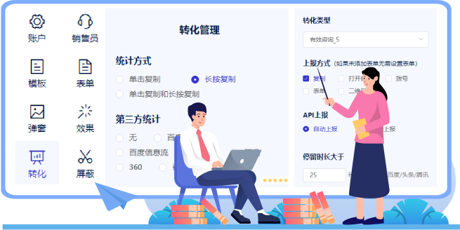 多维度呈现数据,加粉复制统计、访客、转化人群、地区、 IP、时长、关键词、搜索词、浏览深度,全方位详细数据 一目了然,便捷捕获“青”晰的用户画像!