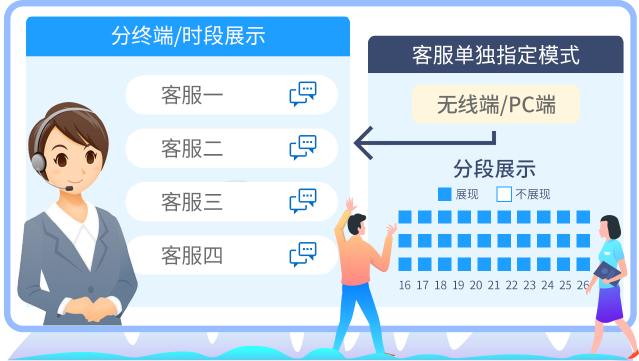 页面秒换客服,支持客服轮流展现,设置权重、 时段分配,客服智能上下线,移动版上线随时随地 换客服,智慧客服,让你省时又省心